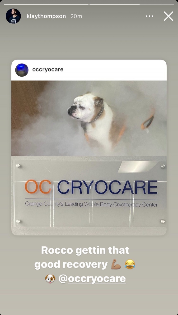 直播吧8月26日讯勇士球星克莱今日在INS上晒出了带Rocco体验冷冻理疗恢复的动态。克莱INS上晒出了带Rocco做冷冻理疗的动态并写道:Rocco正在接受不错的恢复。接受冷冻理疗的Rocco一脸“