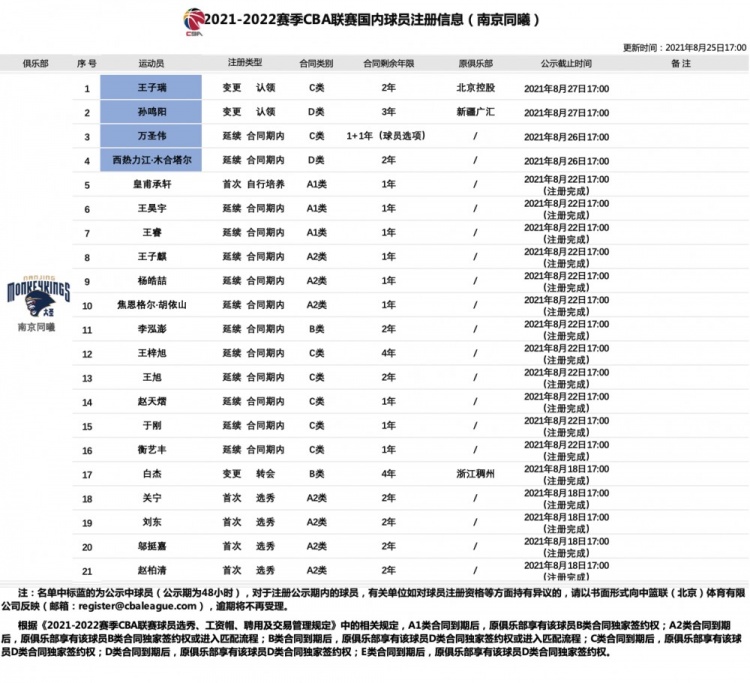 8月25日讯 CBA官方消息,南京同曦男篮认领自由球员王子瑞和孙鸣阳,前者签下一份为期两年的C类合同,后者则是为期三年的D类合同(顶薪)。