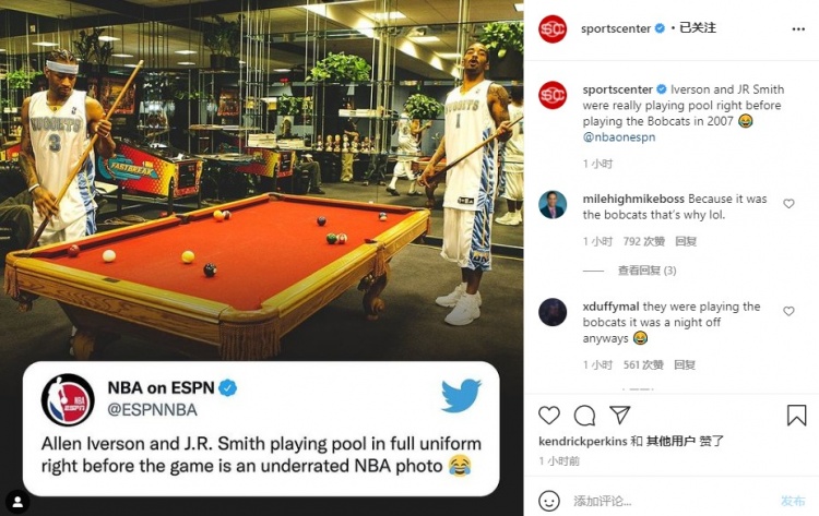 直播吧8月22日讯今日,美媒SportsCenter晒出了一张艾弗森和JR-史密斯掘金时期的老照片,并配文说到:“2007年,艾弗森和JR在与山猫队比赛开始之前穿着球衣在打台球