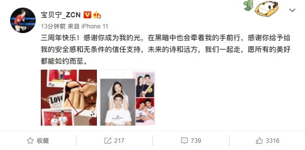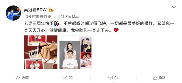 “老婆三周年快乐,不禁感叹时间过得飞快,一切都是最美好的模样。希望你一直天天开心,健健康康,我会陪你一直走下去。❤️ ”吴冠希在图片旁边写道。