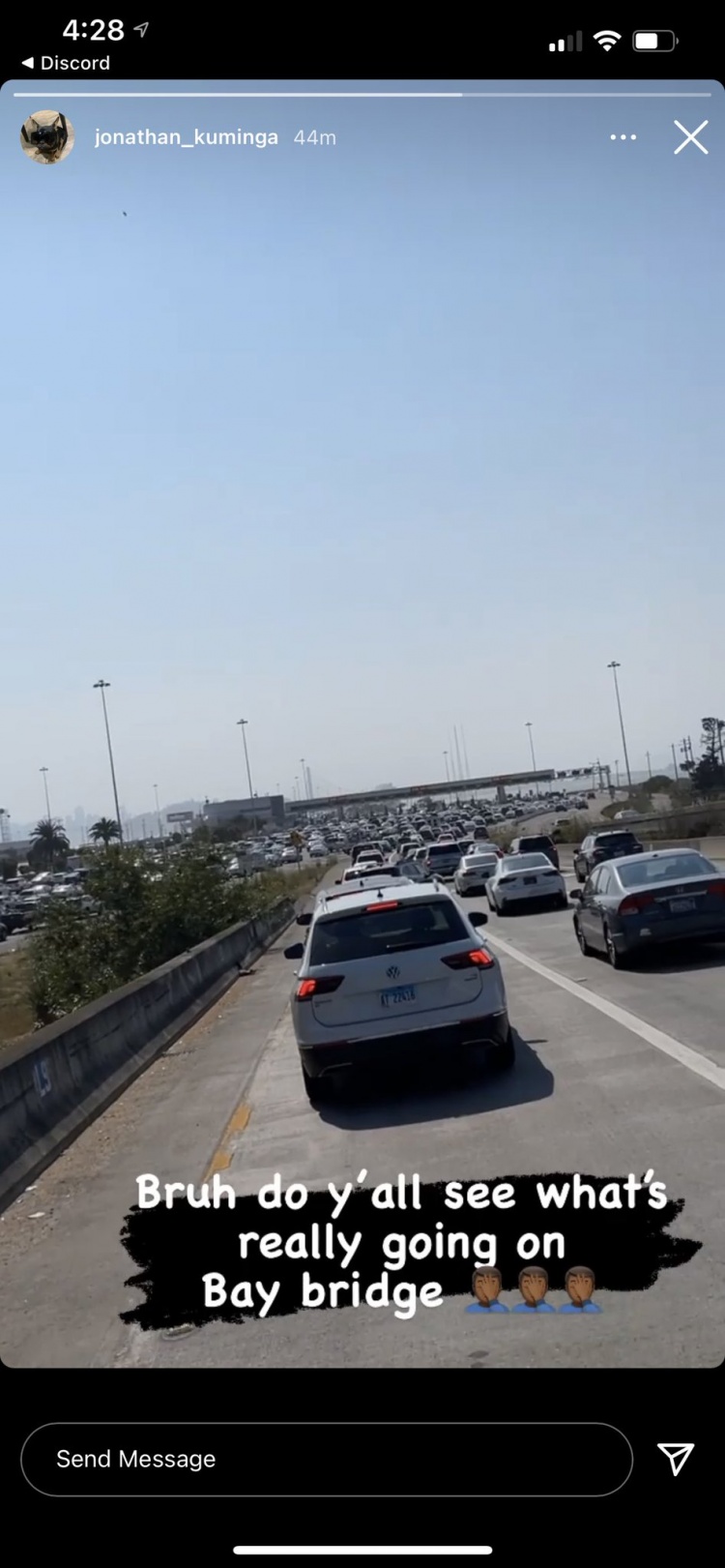 8月29日讯勇士新秀库明加今日晒出了一张自己被堵在海湾大桥上的照片,并吐槽道:“兄弟你们看海湾大桥这情况[扶额][扶额][扶额]”