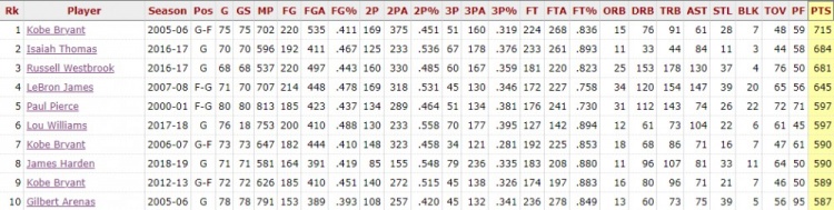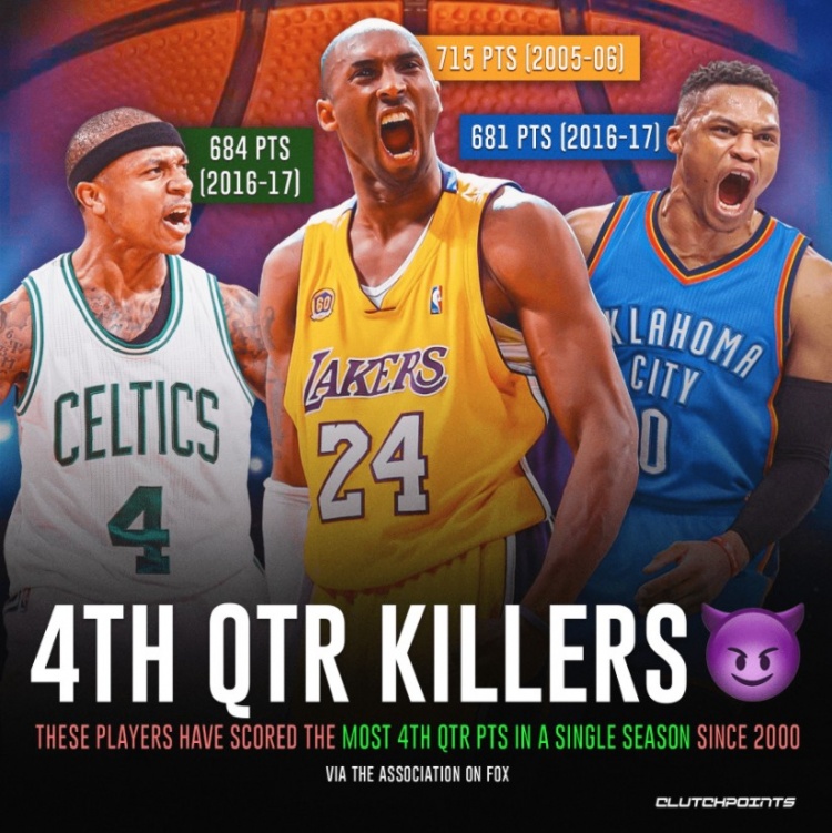 8月29日讯 美媒ClutchPoints今日于推特配图晒出了自2000年来,单个赛季中第四节总得分前三的球员分别为科比、小托马斯与威少。该项数据的前十排名如下: