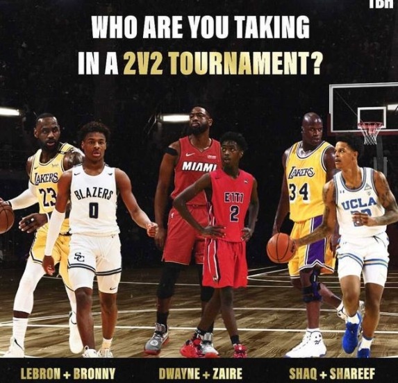 “2V2比赛,你会选择哪一组?”图片上写道。图上的三组父子分别为詹姆斯&布朗尼、韦德&扎伊尔、奥尼尔&沙里夫。