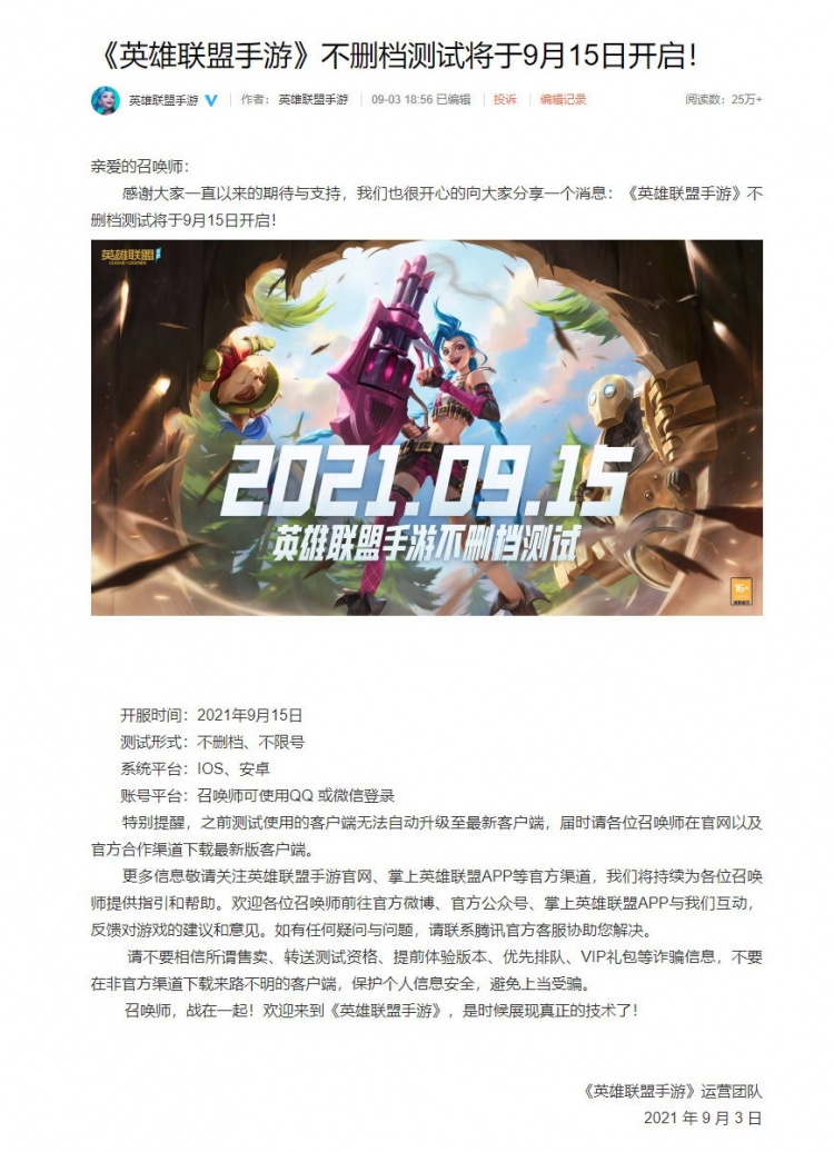 千呼万唤始出来!官方:9月15日LOL手游进行不删档测试2021-09-03 18:48:38 微博 9月3日讯 它!终于来了;今日官方直播间公布手游