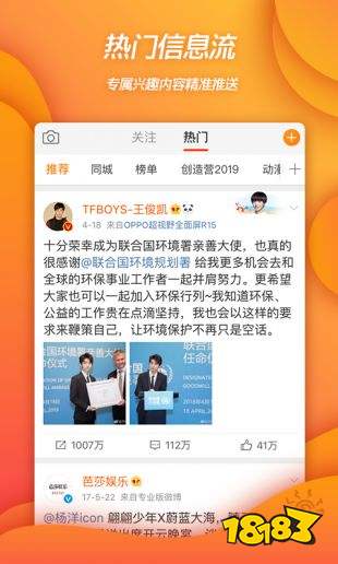 新浪微博app载带你轻松更新浏览你关注的好友、娱乐明星、专家发布的新鲜资讯,能够即时获取国内外热点新闻,网络流行话题,好玩的视频和图片,让你随时随地分享照片、文字、地点或转发有趣的内容给好友。