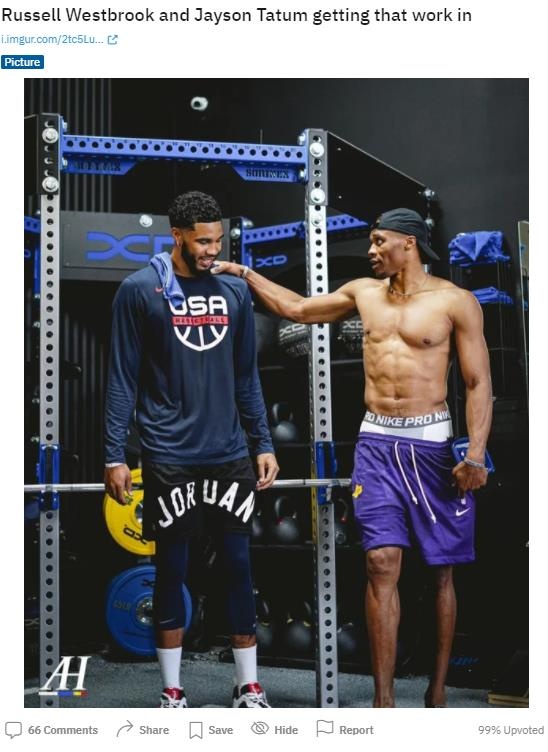 直播吧9月5日讯威少在今年的休赛期通过交易加盟了湖人队,近日有网友拍到威少和塔图姆一起现身健身房,值得一提的是威少已经穿上了湖人队的球裤。这张图片最早由网友发布到了Reddit论坛上,之后湖人记者Ha