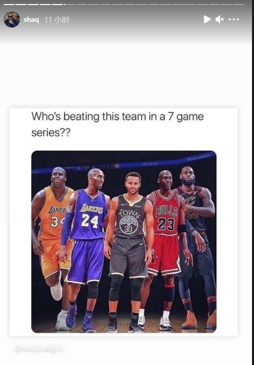 直播吧9月6日讯今日,前NBA巨星奥尼尔更新个人社媒发文,谁能在7场4胜制的系列赛中打败这支队伍?队伍里分别为奥尼尔、科比、库里、乔丹和詹姆斯。(逮虾户)
