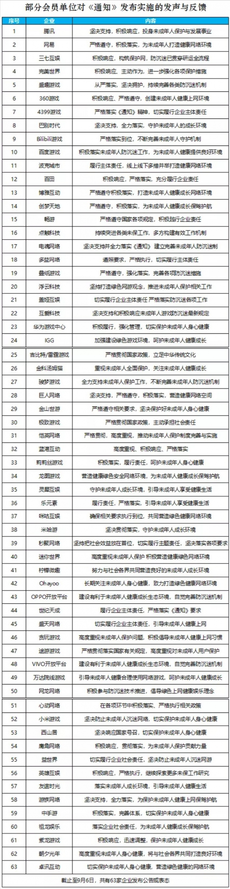截止到今日未成年人网游防沉迷实施已经有第一周。据统计,截至9月6日共有63家单位通过官方渠道以公告、通知等方式,表明态度,回应关切。