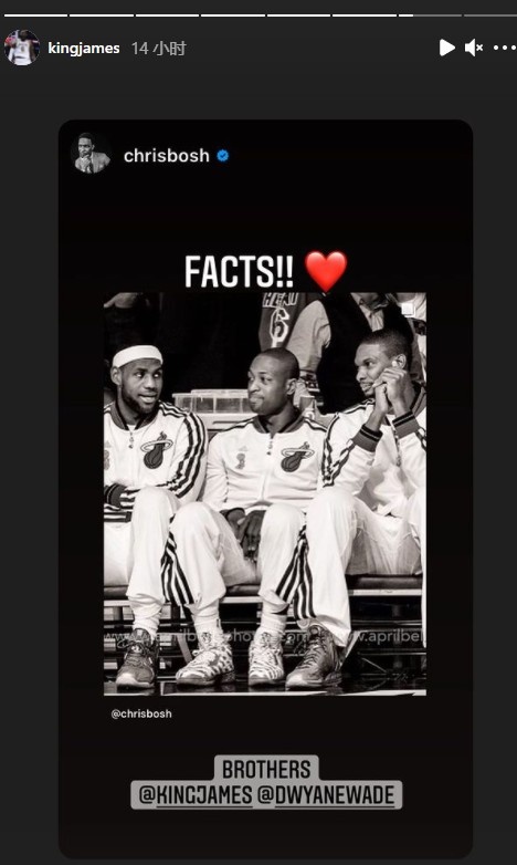 直播吧9月7日讯今日,前NBA球员克里斯-波什更新个人社媒晒出了一张热火三巨头时期的照片并分别@了詹姆斯和韦德并配文说到:“兄弟们!”詹姆斯和韦德分别在社媒转发了这张照片,詹姆斯配文写道:“没有错!”