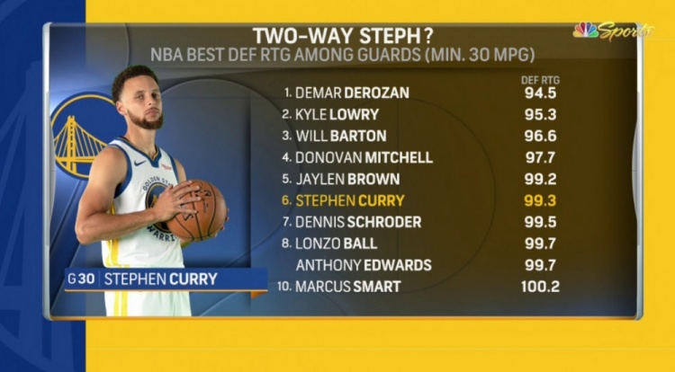 赛后,美媒NBCSWarriors晒出了本赛季后卫防守效率榜前十,其中库里排在第六位,具体排名如下。