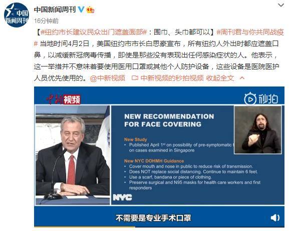 纽约市长建议出门用围巾手帕等遮挡口鼻:口罩留给医护人员2020-04-03 11:53:21 微博4月3日讯 当地时间4月2日,美国纽约市市长白