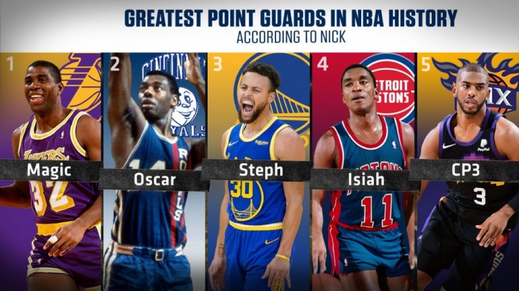直播吧7月3日讯近日,美国体育电视名人&福克斯体育节目主持人NickWright评出了NBA历史最伟大的5大组织后卫。魔术师约翰逊排名第一,接下来依次是奥斯卡-罗伯特森、库里、伊赛亚-托马斯和