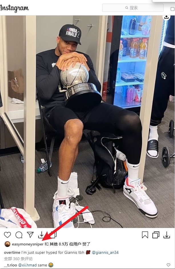 直播吧7月4日讯雄鹿今日战胜老鹰,拿下东部冠军。赛后,美媒Overtime晒出了一张字母哥在更衣室里抱着东部冠军奖杯的照片,并写道:“老实说我真的很为字母哥感到激动”篮网球星杜兰特(Ins用户名eas