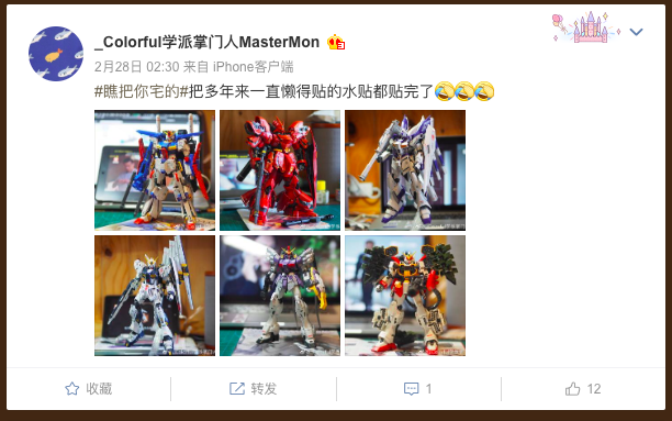 “Colorful学派掌门人MasterMon” 给自己的手办贴水贴,把多年来一直懒得贴的水贴都贴完了。