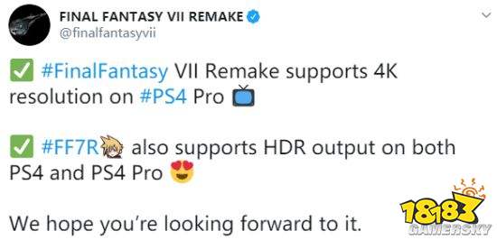 《最终幻想7:重制版》官方推特发布消息,游戏在PS4 Pro平台上可开启4K分辨率;并且在PS4与PS4 Pro上《最终幻想7:重制版》均可以开启HDR(High-Dynamic Range,高动态范围图像)输出。
