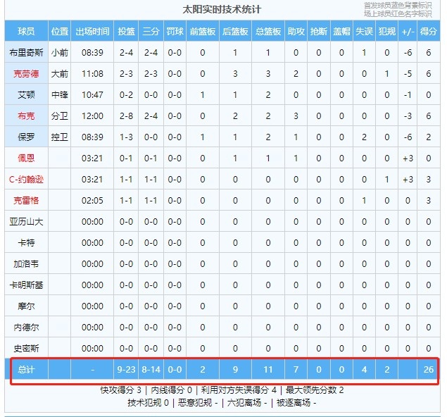比赛首节,太阳全队共得到了26分,其中命中了8记三分球,仅命中1记两分球(9中1)。