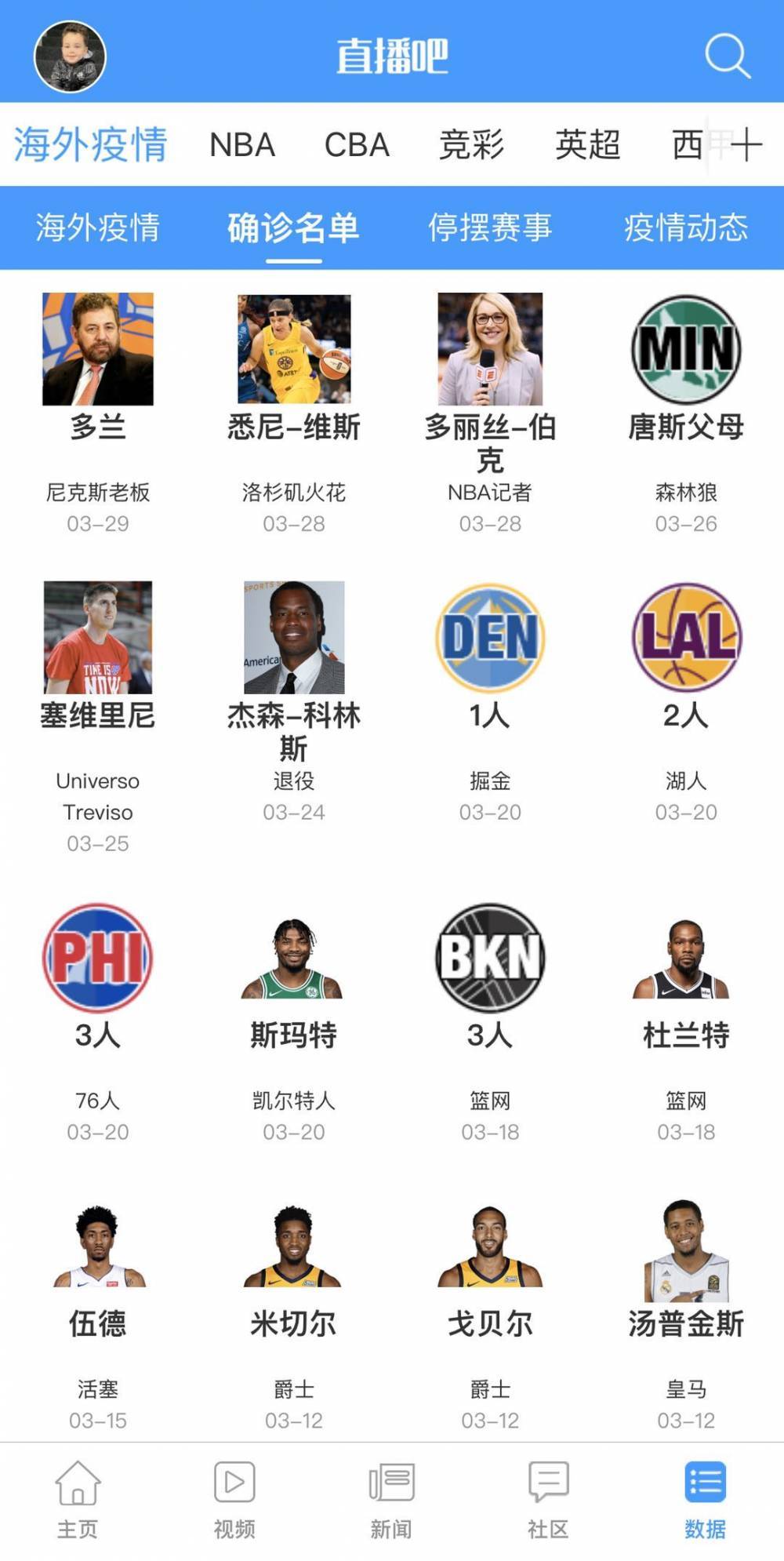 App查询方式:数据—海外疫情-确诊名单注:球队所在州来源维基百科,疫情数据来源于世界实时统计数据网站Worldometer和美国霍普金斯大学网站公布的实时数据,如有错误请吧友在评论区指出。