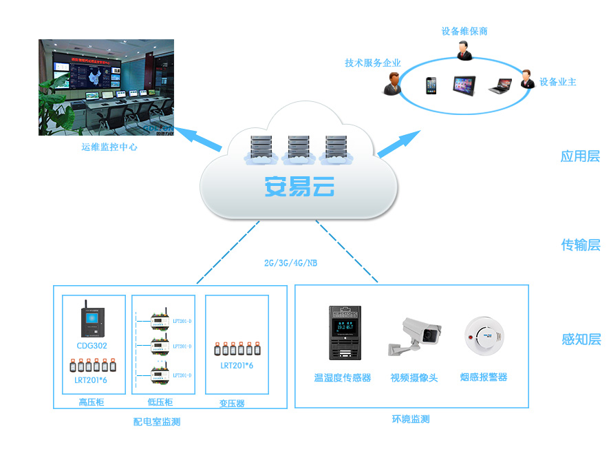 智能供配电工程由安全云表、物联信息采集终端、无线数传终端、云管理平台、通信及供电网络构成。安全云表系列产品基于传统的中低压电气智能化安全综合监控装置,集电气设备负荷监测、电气火灾监控、能耗统计等功能于一身,并可通过自身的无线网络接口,独立或组网实现电气设备的云端化管理。物联信息数据采集终端是一种无线多功能数据采集模块,专门针对动力柜定制设计,内嵌高性能ARM处理器,GPRS/NB无线通讯方式,具有性能稳定,抗干扰性强等特点。安易云开创了采用物联网、云计算、大数据分析等信息技术,对供配电设备进行全生命周期管理的云模式。