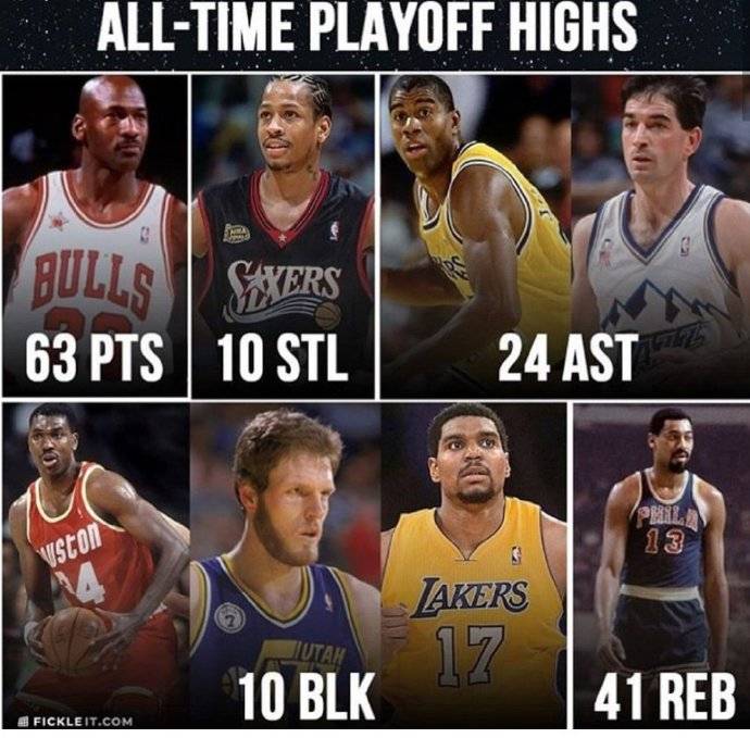 得分之最:乔丹63分;篮板之最:张伯伦41板;助攻之最:魔术师 斯托克顿24助;