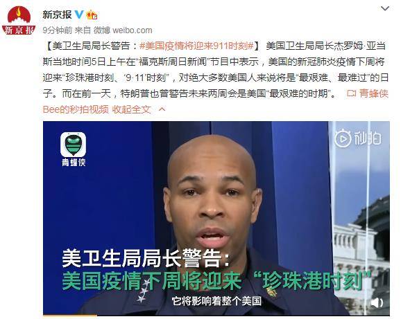 美卫生局局长警告:美国疫情将迎来“911时刻”“珍珠港时刻”2020-04-06 14:23:54 微博4月6日讯 美国卫生局局长杰罗姆-亚当斯当