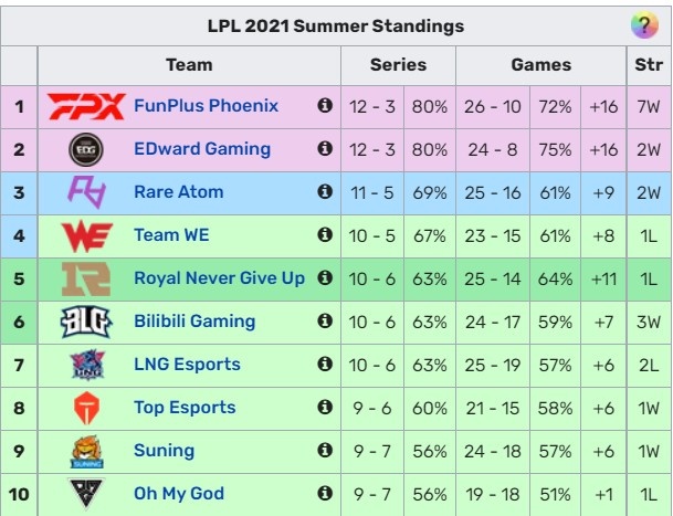 当TES2-1战胜WE时,TES将来到第五,第三为RA,第四RNG,WE则位居第六,之后是BLG、LNG、SN。
