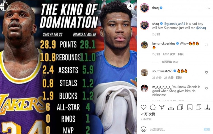 字母哥在得分篮板方面与奥尼尔平分秋色,在助攻和抢断上还些许占优,并且冠军与MVP的数量也超过了同期的奥尼尔,对此,奥尼尔难得大方地表示:“@扬尼斯 是个狠人,叫他超人吧,叫我小沙就行。”