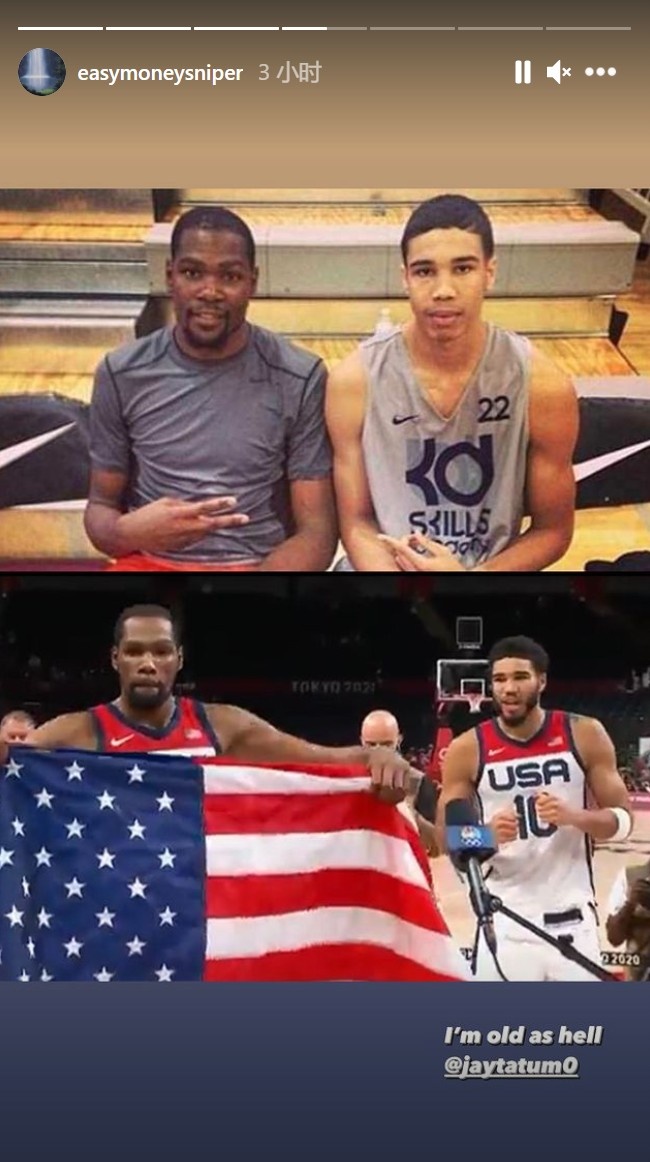 赛后,杜兰特晒出两张自己与塔图姆的合影对比。第一张是塔图姆中学时期参加杜兰特训练营的照片,第二张是昨天两人一起夺金的照片。