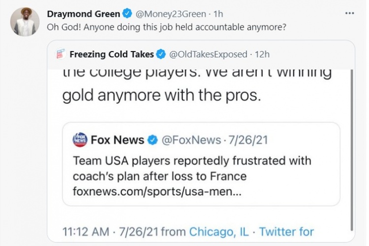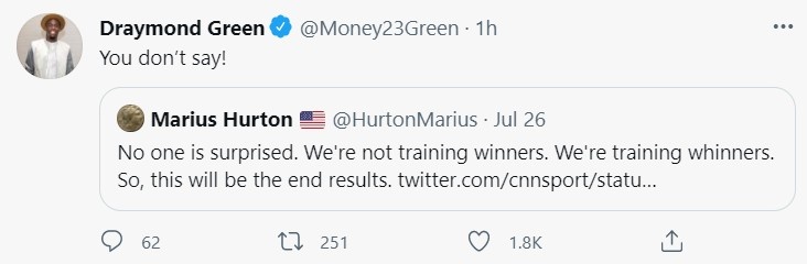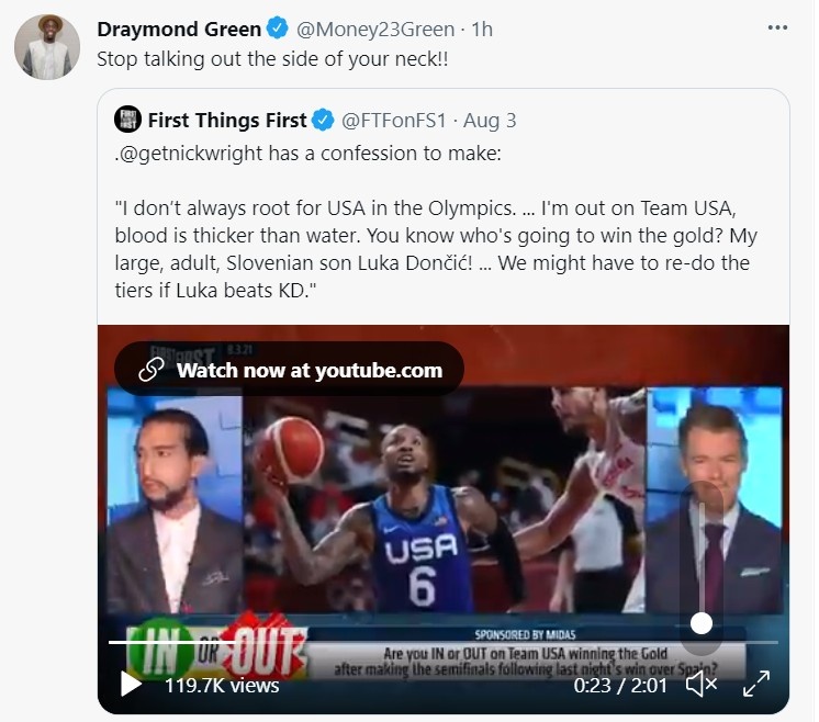 谈到那些质疑者,追梦说道:“每当我打开美国的体育节目,然后就有像帕金斯这样的家伙。你懂的,质疑我们的实力。有人应该教教他们什么是忠诚。是不是应该为你的国家加油呢?当有球员没为国家出战时,就有人说,‘哦,你应该代表你的国家上场。’接着你输了一场比赛,遇到点小挫折。所有人的反应都是,‘哦,其他球队都追上美国了。’你们也是美国人啊。”