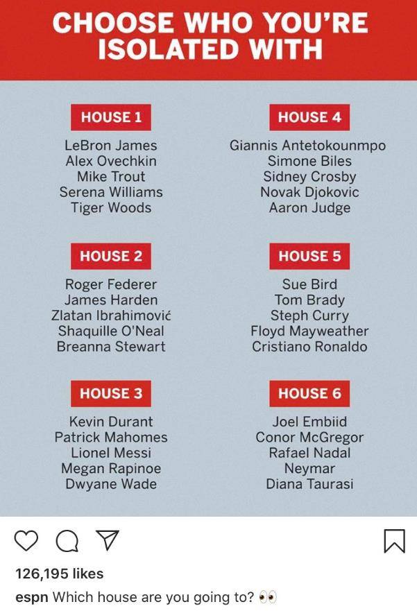 4月7日讯 美国媒体ESPN晒图发问,“你会选择跟谁一起隔离?”