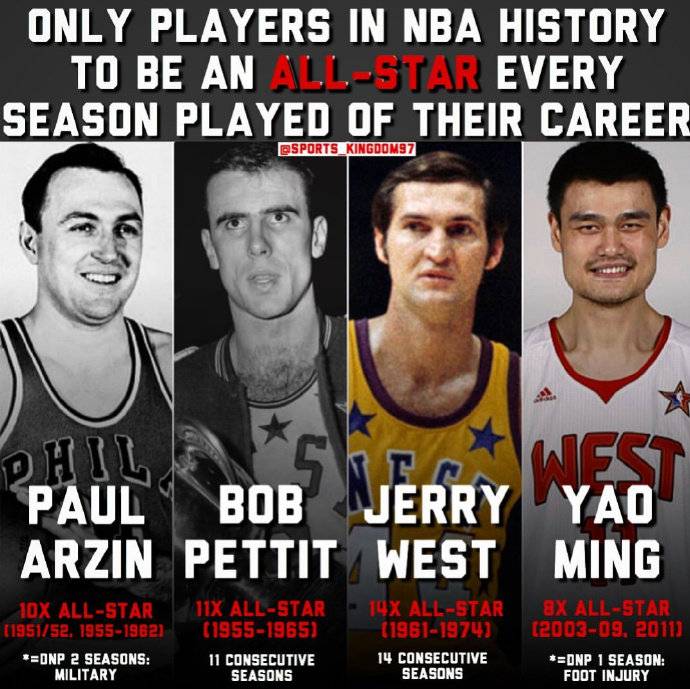 4月7日讯 有美国媒体总结了NBA历史上生涯每个赛季都能入选全明星的球星,一共仅有4位球星,其中姚明也在榜单中!