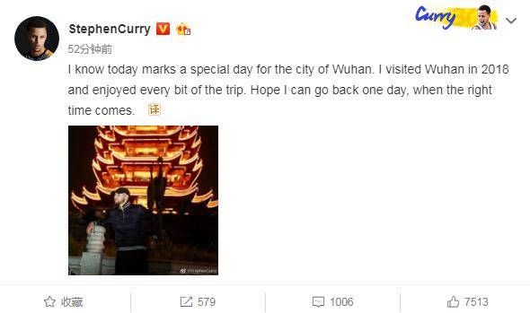 “我知道今天对武汉来说是一个特殊的日子,2018年我去了武汉,享受了旅途中的点点滴滴,希望有一天在适当的时候我可以再去。”库里写道。