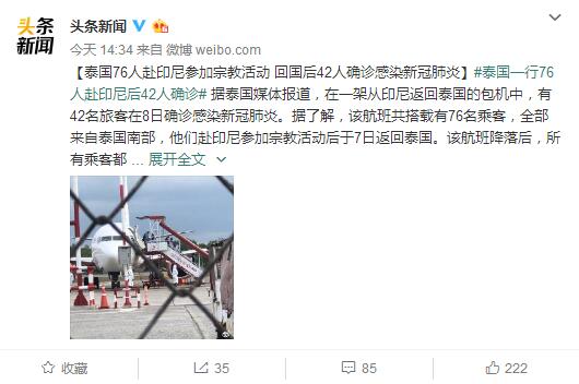泰国76人赴印尼参加宗教活动 回国后42人确诊感染新冠肺炎2020-04-08 15:50:36 微博4月8日讯据泰国媒体报道,在一架从印尼返回泰