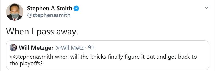 尼克斯何时能重回季后赛?A-史密斯:当我去世时2020-04-09 08:52:06 twitter4月9日讯 著名篮球评论员A-史密斯更新个人社交媒体,