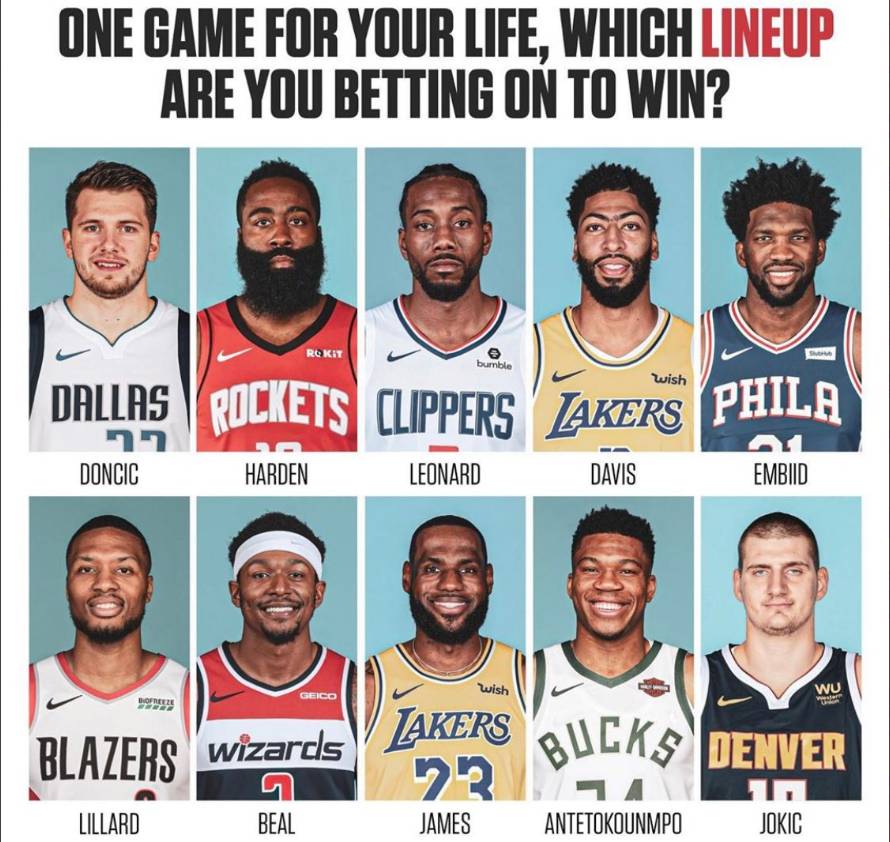 队伍2:利拉德、比尔、詹姆斯、字母哥,约基奇。
