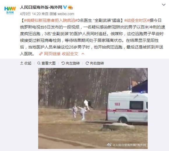 俄确诊患者拒入院疯逃 3名医生 “全副武装”猛追2020-04-09 14:24:16 微博4月9日讯 据今日俄罗斯电视台8日发布的一段视频,一名