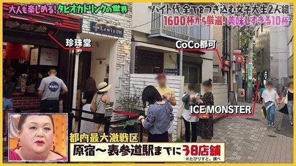 就在上个月,在综艺节目《松子所不知道的世界》里做了一项调查,在东京光奶茶店就有300家。而在原宿的一条街上,单单奶茶店就有38家。感觉整个日本街头都被奶茶给攻陷了。