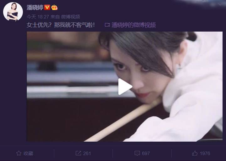 “女士优先?那我就不客气啦!”潘晓婷晒出了一段比赛视频并这样配文到。视频中可以看到有男生要挑战潘晓婷,并称女士优先先开球。