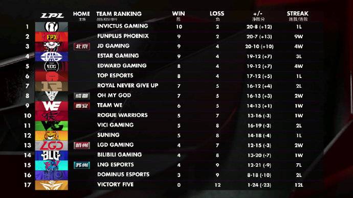 (LPL春季常规赛第六周第四比赛日-赛后积分榜)