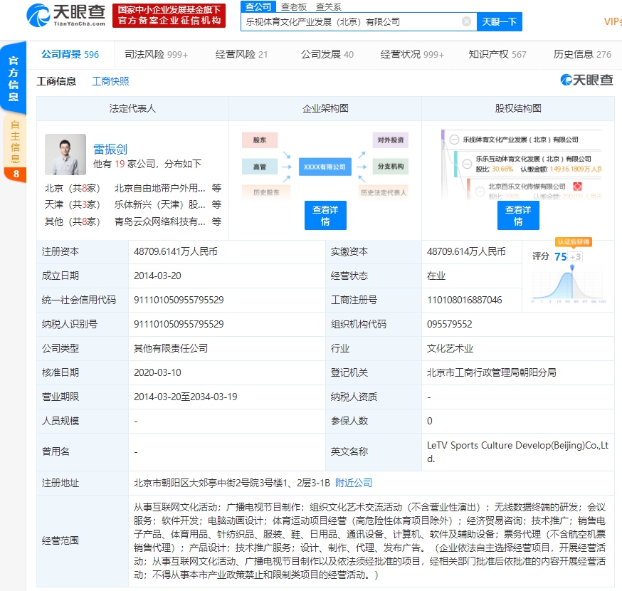 乐视体育文化产业发展(北京)有限公司成立于2014年3月,注册资本约4.9亿元,法定代表人为乐视体育创始人雷振剑,经验范围包括从事互联网文化活动、广播电视节目制作、组织文化艺术交流活动、无线数据终端的研发等。
