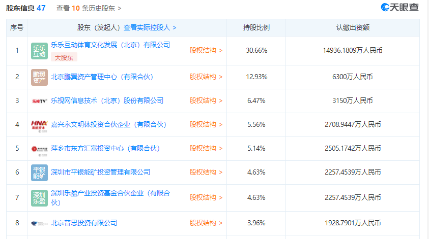 天眼查股东信息显示,乐乐互动体育文化发展(北京)有限公司为该公司大股东,持股比例30.66%,乐视网、北京普思投资有限公司亦在股东之列,分别持股6.47%及3.96%,位列第3及第8大股东。
