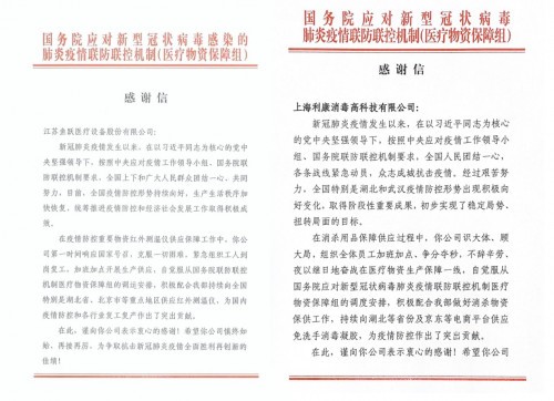 在14亿同胞的共同奋斗下,中国抗疫已接近尾声。3月21日,国务院疫情防控保障小组向鱼跃医疗全资公司利康消毒有限公司发来感谢信,致谢利康消毒(LK、洁芙柔)在本次抗击疫情中做出的贡献。4月2日,国务院再次致信江苏鱼跃医疗设备股份有限公司,对鱼跃医疗在中国抗疫中的卓越成就表达感谢。