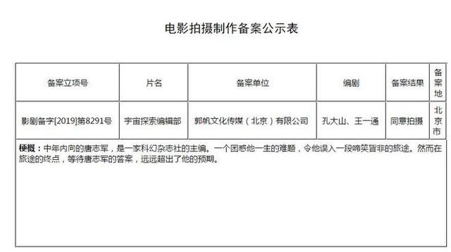 据国家电影局全国电影剧本(梗概)备案、立项公示显示,“郭帆文化传媒(北京)有限公司”备案的项目《宇宙探索编辑部》位列其中。