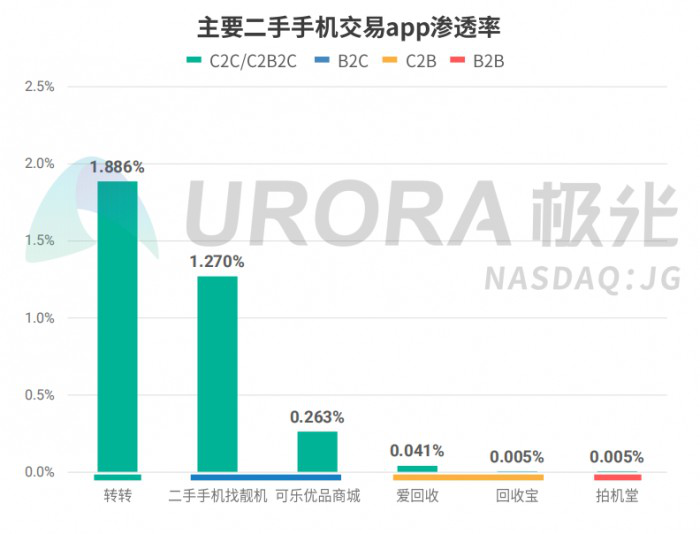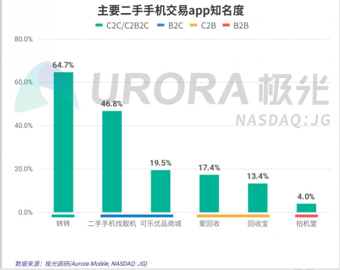 在极光的报告中显示,目前的二手手机行业可分为数个交易模型,其中包括C2C、B2C、C2B2C、C2B与B2B,找靓机作为B2C模式的代表企业,无论在知名度还是渗透率上都遥遥领先。