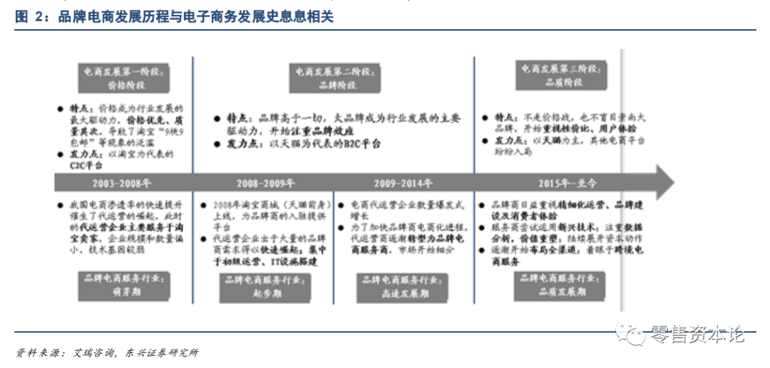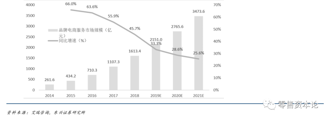 结合历史复盘,东兴证券分析师认为,品牌电商服务市场发展在未来将与电商行业发展呈同步形态,表现为体量不断增大,但增速放缓。