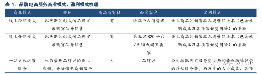 各公司对自身业务的梳理与分类标准各不相同,但东兴证券分析师将其总结为三类:线上经销模式(买断货品)、线上分销模式(买断货品)、一站式代运营服务模式(提供营销、代运营、仓储等运营服务)。