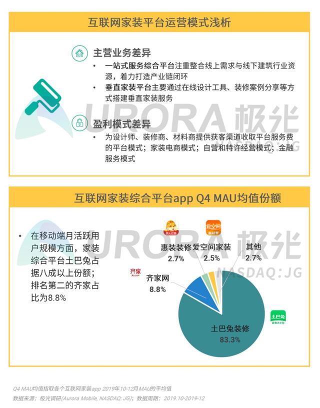 近日,极光发布了《2019年Q4移动互联网行业数据研究报告》,这篇报告全视角展示了移动互联网行业APP装机量、活跃度,热点企业、细分市场等方面信息,其中就移动互联网家装行业的分析可以看到,强者愈强在互联网家装行业也越来越明显,比如综合平台分类里,土巴兔的APP MAU份额达到了83.3%,占据8成以上的份额,几乎是第二名齐家网份额的10倍!