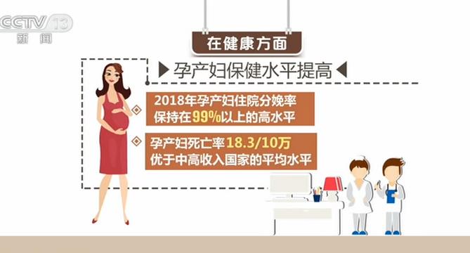 在健康方面,孕产妇保健水平提高,2018年孕产妇住院分娩率保持在99%以上的高水平,孕产妇死亡率18.3/10万,优于中高收入国家的平均水平。