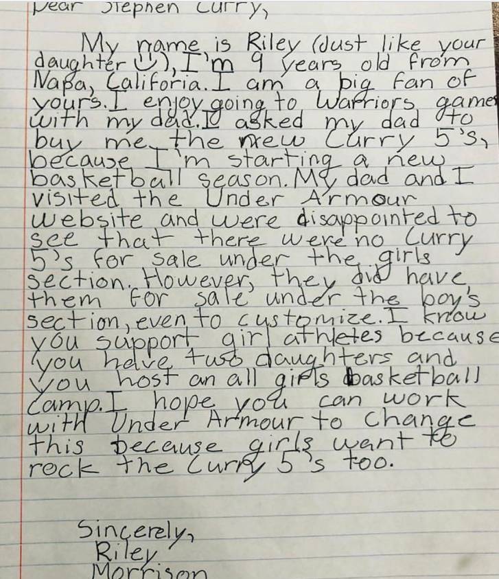 莱莉给库里写信称,库里第五代战靴有给男孩儿(boys)穿的款式,但没有给女孩儿穿的,希望库里能够解决这个问题,因为自己也想穿库里的球鞋。