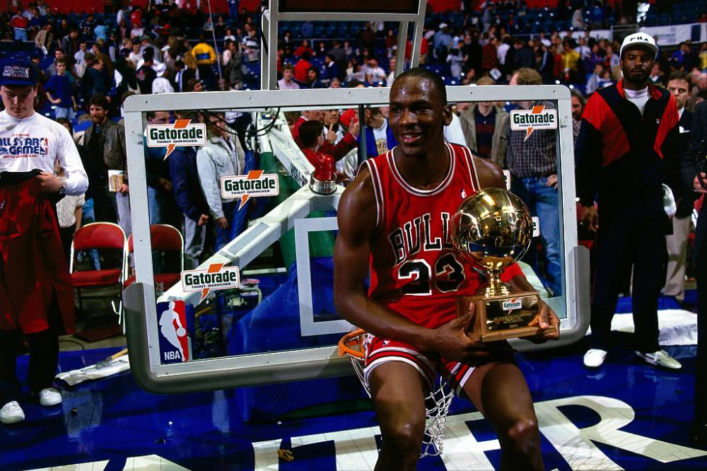 1988年2月6日 乔丹在全明星扣篮大赛上演经典的罚球线扣篮 力压威尔金斯当选扣篮王