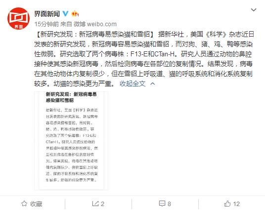 新研究发现:新冠病毒易感染猫和雪貂2020-04-10 12:44:29 微博4月10日讯据新华社,美国《科学》杂志近日发表的新研究发现,新冠